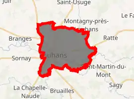 Louhans is centrally located on the plain of Bresse.[3] The Vallière forms part of the commune's southeastern border, then flows into the Solnan, which forms part of the commune's southern border. The Solnan flows into the Seille in the town. The Seille flows south-southwest through the western part of the commune and crosses the town.