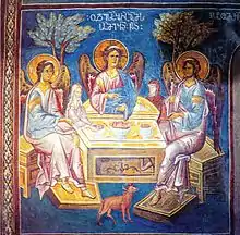 The Lykhny church is a domed cross-in-square design, built of straight rows of well-refined ashlar stone. The small dome, with a low drum and a sloping roof,[1] is based on four freely standing piers. The western portion of the building includes an upper gallery. The façades are simple, apertured with windows and marked with three protruding apses protruding from the east wall. There are traces of the 10th-11th-century wall painting, but the extant cycle of frescoes date to the 14th century. They are characterized by neatly colored, dynamic, and expressive paintings of somewhat elongated human figures.[2][3]