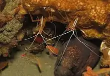 Lysmata amboinesis, like other cleaner shrimp, has a symbiotic relationship with 'client' fish in which both organisms benefit; the shrimp gain a meal from eating parasites living on large fish and the clients benefit from the removal of parasites.[2] Cleaning organisms including shrimp and fish can congregate in one location on a reef in what is called a "cleaning station" which fish will visit when required; cleaning shrimp perform a rocking dance from side to side to signal their services when fish approach.[11] Removal of parasites under captive conditions happens mainly at night though it is unknown whether this is due to shrimp or host fish behaviour.[12] Additionally, cleaning services provided by the shrimp aid wound healing of injured fish supporting the symbiosis hypothesis.[13] L. amboinesis is also commonly found living in caves with their client fish, such as moray eels, providing the shrimp with protection from predators.[14]