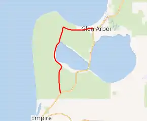 M-109 starts at an intersection on M-22 north of Empire. The trunkline runs northward along Dune Highway past Maple Grove Cemetery and through woods in the Sleeping Bear Dunes National Lakeshore.[3][4] The area was named the "Most Beautiful Place in America" by Good Morning America in August 2011;[5] the designation came after a social media campaign to capitalize on the show's website poll.[6] Further north, the highway passes the entrance to Pierce Stocking Scenic Drive before running along the western shore of Glen Lake. Near the northwestern corner of the lake, M-109 passes the entrance to the Dune Climb in an area that's predominantly fields. The trunkline makes a 90-degree turn at the intersection with Glen Haven Road, the former M-209, south of Glen Haven, a former logging town on the shores of Lake Michigan. M-109 turns easterly at the intersection to follow Harbor Highway. It runs through another wooded area between Glen Lake and Sleeping Bear Bay. The highway passes the D.H. Day Campground and enters Glen Arbor, following Western Avenue. At the intersection with M-22 (Ray Street), M-109 terminates in the middle of town.[3][4]