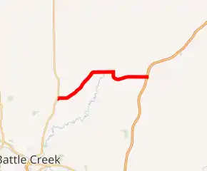 M-78 begins at an intersection with M-66 in Pennfield Township, north of Battle Creek in Calhoun County. The trunkline passes through rural farm lands as it runs due east and northeast. It briefly crosses the southeast corner of Barry County as it enters Eaton County. There M-78 follows Battle Creek Highway past some small ponds and into the town of Bellevue. The trunkline becomes Capitol Avenue in town and turns south onto Main Street in the middle of the central business district.[3][4] M-78 crosses a branch line of the Canadian National Railway before leaving town.[4][5] Main Street turns easterly and becomes Butterfield Highway. M-78 crosses the Battle Creek River before terminating at I-69's exit 48 in Bellevue Township.[3][4]