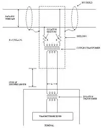 In a transformer coupled stub, the length of the stub cable should not exceed 20 feet (6.1 m), but this may be exceeded "if installation requirements dictate." The coupling transformer has to have a turns ratio of 1:1.41 ± 3.0 percent. The resistors R both have to have a value of 0.75 Zo ± 2.0 percent, where Zo is the characteristic impedance of the bus at 1 MHz.