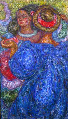 Influences of seminal European antecedents conspicuously permeated Tennent's transitional paintings of the late 1920s and early 1930s, such as Bathers (1926), Hawaiian Girl (1926), Girl with Apples (1926), Makuahine (1927), and Olympia of Hawaii (with Apologies to Manet) (1927). Olympia of Hawaii, in the collection of the Honolulu Museum of Art, exemplifies Tennent's enchantment with color and use of the bright, warm hues endemic to Hawaiʻi. She adapted line and form to the appropriately vivid medium of oil. The majestic, explicitly Polynesian women that would figure in Madge Tennent's iconic imagery surfaced in works such as Reclining Girl (1929) and Three Filipino Ladies (1930), each a synthesis of European modernism's languid, architectonic femininity with Tennent's own racial fixation. Generously applying paint with a palette knife, she avoided sensuousness in the representation of skin texture, instead imbuing the trademark sense of strength and grandeur tinged with fragility apparent in Holoku Ball and Hawaiian Singer (early 1930s). Just as Tennent constructed her wahines layer by layer in paint, she built her canvases to equally monumental proportions; when standard issue could no longer satisfy her vision, she sewed pieces of canvas together to attain the desired size.[8]:100
