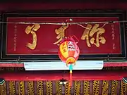 Afterwards, Magong Chenghuangye named Lin Ying Hou (Chinese: 靈應侯; pinyin: líng yīng hóu ) as well.[4] The meaning of Lin Ying Hou, its first character Lin (靈) means "spirit"; and the second character Ying (應) means "feel" or "answer"; the third character Hou (侯), means " one of ranks of Chinese nobilIty". So, Lin Ying Hou (靈應侯) means that this lord of god who will show its spirit to answer you, or you can feel the spirit appear.