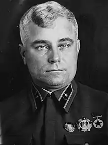 Postwar, Teryokhin commanded the army until December 1945, then became commander of the 36th Guards Rifle Corps from July 1946 to 20 May 1948.[8] In 1949, he graduated from Higher Academic Courses at the Higher Military Academy (formerly the Military Academy of the General Staff), after which he became assistant commander of the troops of the Belomorsky Military District and then the Northern Military District. Teryokhin retired in August 1954 and moved to Ryazan, where he died on 30 March 1967.[3] He was buried at the city's Skorbyashchensky Cemetery.[2]