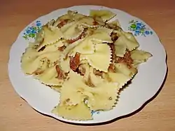 Makarony po-flotski (Russian: макароны по-флотски, literally navy-style pasta) is a Russian dish made of cooked pasta (typically macaroni, penne or fusilli) mixed with stuffing made of stewed ground meat (usually beef or pork), fried onions and seasoned with salt and black pepper.[1][2] Originally served in maritime forces, the dish became very popular in Russia because of simplicity, low costs and quickness of its preparation. Makarony po-flotski became highly popular after the World War II during times of poverty in Soviet Union.