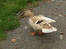In captivity, domestic ducks come in wild-type plumages, white, and other colours.[35] Most of these colour variants are also known in domestic mallards not bred as livestock, but kept as pets, aviary birds, etc., where they are rare but increasing in availability.[35]