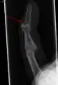 A mallet finger, also known as hammer finger or PLF finger, is an extensor tendon injury at the farthest away finger joint.[2] This results in the inability to extend the finger tip without pushing it.[3] There is generally pain and bruising at the back side of the farthest away finger joint.[3]