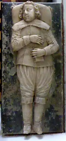 By Jane Windham he had a son[21] and heir apparent Thomas Welsh (1629–1639), who died aged 10,[22] whose chest tomb with alabaster effigy survives in Alverdiscott Church. The effigy was described by Nikolaus Pevsner as a "touching, life-size effigy in Van Dyck dress".[23]