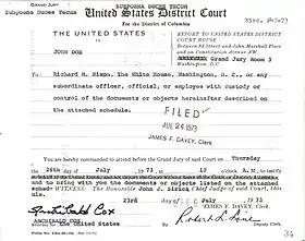 Marbury also established that the power of judicial review covers actions by the executive branch—the President, his cabinet members, and the departments and agencies they head.[66] However, American courts' power of judicial review over executive branch actions only extends to matters in which the executive has a legal duty to act or refrain from acting, and does not extend to matters that are entirely within the President's discretion, such as whether to veto a bill or whom to appoint to an office.[66] This power has been the basis of many subsequent important Supreme Court decisions in American history, such as the 1974 case United States v. Nixon, in which the Court held that President Richard Nixon had to comply with a subpoena to provide tapes of his conversations for use in a criminal trial related to the Watergate scandal, and which ultimately led to Nixon's resignation.[67]