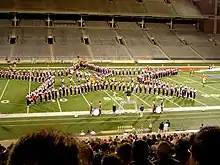 "Revised Entrance #3", originally based on the ″Governor′s March″ (1935) by Col. Armin F. Hand, the pregame opener and calling card of the Marching Illini, combines an opening fanfare with a march version of the Illinois state song. The band moves into dual U of I logos, and then transform into four arcs – two arcs facing each sideline. Sousaphones and percussion are centered between the arches, while the auxiliaries flank both sides of the band.“Patriotic Medley” follows, and the winds adjust to an outline of the United States, while the percussion form the state of Illinois with one cymbal player strategically placed in Champaign. At the climatic point of “God Bless America,” a dramatic high chair 4-count turn to the home stands accompanies a downward cascade in the music, and the crowd invariably applauds. After a short mark-time, the formation changes to a large rectangle. During “Battle Hymn of the Republic,” the rectangle compresses into a circle, pentagon, and finally a star, where the band halts and finishes the medley with the closing phrases of “America The Beautiful.”