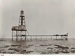 ![]() Cape Jaffa Lighthouse (circa 1910) showing the full lighthouse installation standing on the reef. The lantern room and keepers accommodation on the left hand side of the image were removed during the 1970s. | |