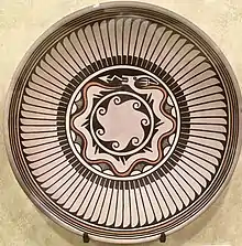 Maria Montoya Martinez (1887, San Ildefonso Pueblo, New Mexico – July 20, 1980, San Ildefonso Pueblo) was a Native American artist who created internationally known pottery.[2] Martinez (born Maria Poveka Montoya), her husband Julian, and other family members examined traditional Pueblo pottery styles and techniques to create pieces which reflect the Pueblo people's legacy of fine artwork and crafts. The works of Maria Martinez, and especially her black ware pottery, survive in many museums, including the Smithsonian, the Metropolitan Museum of Art, the Denver Art Museum, and more. The Penn Museum in Philadelphia holds eight vessels – three plates and five jars – signed either "Marie" or "Marie & Julian".[3] Maria Martinez was from the San Ildefonso Pueblo, a community located 20 miles northwest of Santa Fe, New Mexico. At an early age, she learned pottery skills from her aunt[4] and recalls this "learning by seeing" starting at age eleven, as she watched her aunt, grandmother, and father's cousin work on their pottery during the 1890s.[5] During this time, Spanish tinware and Anglo enamelware had become readily available in the Southwest, making the creation of traditional cooking and serving pots less necessary.[6] Traditional pottery making techniques were being lost, but Martinez and her family experimented with different techniques and helped preserve the cultural art.[2]:62–63