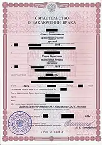 A certificate of marriage is the only legally valid document on the registration of marriage in Russia. Issued in the certification of the fact of state registration of the civil status act, signed by the head of the registry office and is sealed with its seal.[10]