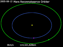 Completion of the orbital insertion placed the orbiter in a highly elliptical polar orbit with a period of approximately 35.5 hours.[14] Shortly after insertion, the periapsis – the point in the orbit closest to Mars – was 426 km (265 mi) from the surface[14] (3,806 km (2,365 mi) from the planet's center). The apoapsis – the point in the orbit farthest from Mars – was 44,500 km (27,700 mi) from the surface (47,972 km (29,808 mi) from the planet's center).