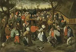 Van Cleve developed a number of new themes such as the King Drinks, the original of which is probably the painting sold at Kunsthandel Abels, Cologne in 1965. This theme invented by van Cleve became very popular in the next century.[8] His 'The good shepherd' was another original creation, which was widely imitated. Many Flemish artists, and in particular Pieter Bruegel the Younger, were inspired by these subjects.[11] Marten van Cleve is believed to have been an important influence on the development of Pieter Brueghel the Younger's style, along the more widely recognised precedent of his father, Pieter Bruegel the Elder.[4] The peasant wedding was a favourite theme of Cleve. He returned frequently to this subject depicting its various rituals and ceremonies, mostly in the form of cycles of small-scale panels. His Wedding Procession was widely copied by his workshop as well as Pieter Bruegel the Younger.[9] Another popular theme of van Cleve was The Massacre of the Innocents and his version of this subject was copied even more frequently than the version of Pieter Bruegel the Elder.[8] The attribution to van Cleve and his workshop of the various versions of the Massacre of the Innocents has been questioned on stylistic grounds, in particular on the basis of the fact that the more painterly handling of paint that is ascribed to van Cleve is missing in this body of work.[6]