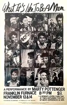 Pottenger was playwright, director and solo performer in this 1987 piece. She combined music, stories, and dance to examine the condition of the lives of men. What It's Like to be a Man was performed at avant-garde New York City art space Franklin Furnace (1987, 1988) where it received a "Jerome Award." Pottenger also performed it at Pyramid Art Space, Rochester NY; Diverseworks, Houston TX with PS 122 Field Trips A census-taking, standup tragic comedy show that at times resembles an action-adventure magazine. A vast hys/torical survey of men's lives as men as told by the men themselves. The stories drawn from over 60 interviews include "Harry Belafonte, Genghis Khan, Kermit & Me," "Real Penis Stories," "Most-Best-Time-With-My-Dad" and "Slowly I Turn ..."