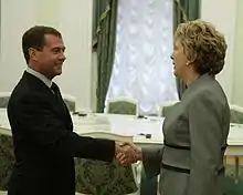 She made an official visit to Russia, with Minister of State, Billy Kelleher, for four days in September 2010, and met with President of Russia Dmitry Medvedev.[61][62] She spoke kindly of Mikhail Gorbachev, officially invited Medvedev to Ireland, and addressed students at a university in Saint Petersburg. She called for warmer relations between the European Union and Russia.[63][64][65] On her state tour to Russia, highlighting the importance of competence, she launched an unprecedented attack on the Central Bank of Ireland, for their role in the financial crisis which resulted in tens of thousands of people in mortgage arrears.[66][67]