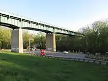 The first ferry at the German Crossing of the Potomac River, named for the German settlement at Lovettsville, began at the site of Brunswick in 1731.[19] The first fixed crossing of the river was a covered bridge constructed between 1854 and 1857 by the Loudoun and Berlin Bridge Company; this bridge was burned by Confederate forces in June 1861. In 1893, the Loudoun Berlin Bridge Company constructed an iron through truss bridge across the river on the abutments of the covered bridge.[19][20] Both the covered bridge and the iron bridge were located in line with Virginia Avenue, immediately to the east of the modern bridge.[21] Later, the access road to the bridge would follow Maple Avenue south from Petersville Road, cross the Baltimore and Ohio Railroad, turn west onto what is now the access road for the C&O Canal Historical Park, then turn south to cross the river.[22] Construction on the modern Brunswick Bridge began in 1952 with preliminary engineering work and construction of the bridge's substructure and superstructure, which were completed in 1953.[23][24] Work on the bridge's deck and the Maryland approaches began in 1953 and continued through 1954.[24] The Brunswick Bridge was dedicated July 30, 1955.[19]