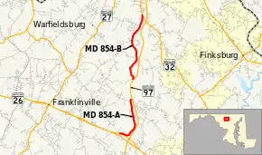 Maryland Route 854 (MD 854) is a collection of state highways in the U.S. state of Maryland. This pair of highways comprise the old alignment of MD 97 between MD 26 near Eldersburg and MD 32 in Fenby in Carroll County. MD 854A and MD 854B, which have lengths of 2.64 miles (4.25 km) and 3.93 miles (6.32 km), respectively, are separated by Morgan Run Natural Environment Area.