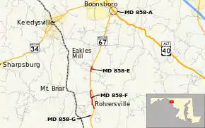 - MD 858G is the designation for an unnamed 0.07-mile (0.11 km) section of old alignment of MD 67 south of Rohrersville. MD 858G once continued south 0.22 miles (0.35 km) to an intersection with Trego Road.[1][4]