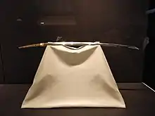 A peculiar work of Masamune, once in the possession of the Tokugawa Shogunate through the Kii Domain and gifted to the main Tokugawa family line in Edo in its prime.[29] Upon the end of the Tokugawa Era marked by the Bakumatsu, the Musashi Masamune was presented as a gift by Tokugawa Iesato in honor of Yamaoka Tesshū's efforts to facilitate peaceful negotiation with Katsu Kaishū to Saigō Takamori, sparing Edo from war and needless destruction; however, Yamaoka was humbled upon being given such a masterpiece, and had passed it down to statesman Iwakura Tomomi. Soon after seeing it passed from hand to hand throughout the 20th Century, the Musashi Masamune finally made its way to the Nihon Bijutsu Token Hozon Kyokai in the year 2000 by Motoo Otsuyasu. The Musashi Masamune is a tachi, measuring 74 cm (2 korai-shaku, 1 sun, 4.2 bun) and noted to have nearly all of the characteristics of Masamune's signature features; though it is debated that its o-kissaki is not that of his style, it is compared to blades made in his later career, which shows the transition of the Kamakura styles into the Nanbokucho era. It is rumored that, while the blade is named after Musashi Province, where Edo and current day Tokyo stands, its origin stems from being once in the possession of Miyamoto Musashi, who is considered Japan's most famous swordsman. The sword is classified as a meibutsu National Treasure of Japan.