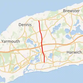 Massachusetts Route 134 is a 5.31-mile-long (8.55 km) north–south state highway entirely within the town of Dennis on Cape Cod in the U.S. state of Massachusetts. About 5.3 miles (8.5 km) long, Route 134 begins at an intersection with Route 28 in South Dennis. The route crosses north through Dennis, crossing US 6 at a cloverleaf interchange mid-way through. Route 134 ends at a junction with Route 6A in East Dennis, not far from Cape Cod Bay.