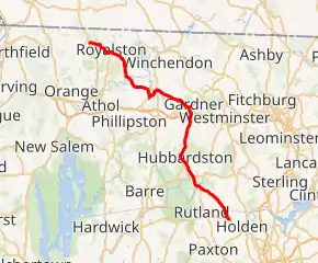 Route 68 is a 36.14-mile-long (58.16 km) south–north state highway in Massachusetts. Its southern terminus is at Route 122A in Holden and its northern terminus is at Route 32 in Royalston. Along the way it itersects Route 2 in Gardner and U.S. Route 202 (US 202) in Templeton.