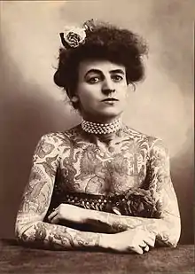 As an apprentice of her husband, Wagner learned how to give traditional "hockey-pokey" tattoos—despite the invention of the tattoo machine—and became a tattooist herself.[4] Together, the Wagners were two of the last tattoo artists to work by hand, without the aid of modern tattoo machines.[5] Maud Wagner was the United States' first known female tattoo artist.[3]