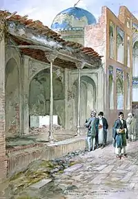 The tomb itself survived various calamities; including several major earthquakes (Nishapur being on a seismic fault-line),[2]:68 raids by some Turkic tribes, and the Mongol invasion.[3]:16 In the succeeding centuries, Omar's grave had become situated in an open wing of a shrine of a certain Islamic saint called Imamzadeh Muhammad Mahruk (d. eighth century), the brother of Reza. According to Percy Sykes, who visited the poet's tomb twice, the saint's mortuary shrine contained a formal Persian garden with cobbled paths.[4] The shrine had a turquoise dome and was likely erected in the seventeenth century,[3]:17 or possibly earlier by Shah Abbas.[4]:283 Some pilgrims to Omar's grave, such as the Iranologist, A. V. Williams Jackson who visited it in 1911, described his tomb as a simple case made of brick and cement with no inscription.[3]:16