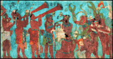 According to Cogolludo, the holpop was not only "the principal singer who sets the key and teaches what is necessary to sing," but also the keeper of the musical instruments, first of all the [horizontal] tunkul drums.[20] In the Rabinal Achí, a Highland Maya 'tun-dance' drama dating back to the 16th century, the stage and music director is usually the one who plays the ancient wooden slit-drum (tun), accompanied by two trumpets. The most complete depiction of a Classical period musical performance is that on the lower walls of a Bonampak temple room (room 1). Dating back to AD 791, it shows a royal dance accompanied by a file of twelve musicians divided into sections: pairs of large rattles (5 players) - a high, vertical drum (1 player) - large, portable turtle/tortoise drums played with sticks (3 players) - long trumpets (2 players) - rattle and ocarina (1 player). In between the turtle drums and the trumpets is a group of five theatrical impersonators surrounding a young noblewoman. The trumpets may have started, with the standing drum then assuming the lead part. Among the Maya, group dances were considered highly sacred. According to Bishop Diego de Landa groups of men and women danced separately and had particular musical ceremonies in which they specialized. De Landa described a dance in which two men led the steps. One hurled reeds at the other man for him to catch, while they both performed complicated dance steps. Landa also witnessed a sacred war dance, in which as many as 800 men carrying small banners followed a complex pattern of steps in perfect unison.[21] Some of the earliest known Mayan dances were associated with shamanistic rituals and altered states of conscious. Dance may have been a way of giving sacred beings life and voice through the dancer's movement and song. Combined with music and the fragrance of burning offerings, dance was often regarded as the direct manifestation of supernatural forces.[22]
