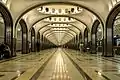 The name as well as the design is a reference to Futurism and its prominent Russian exponent Vladimir Mayakovsky. Considered to be one of the most beautiful in the system, it is a fine example of pre-World War II Stalinist Architecture and one of the most famous Metro stations in the world. It is most well known for its 34 ceiling mosaics depicting "24 Hours in the Land of the Soviets." During World War II, it was used as a command post for Moscow's anti-aircraft regiment.[1]