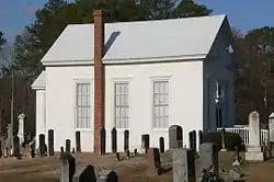 The property consists of a single-story church facing east-northeast, surrounded by a cemetery.[2] The church proper is a simple wood-framed gabled structure covered in asphalt shingles, with a chancel projecting from the back and a brick chimney applied to the south side.[2] The facade features an open pediment in the gable and a pair of windows flanking the central entrance, with a wooden sign over the door; each side also has three tall, narrow double-hung windows, with a smaller window on either side of the chancel.[2] The interior is fitted with box pews flanking a center aisle, and a pulpit and altar, also aligned with the center line of the building. The chancel opening has plain casing surmounted by a pediment; the back wall of the altar area is ornamented by column casing supporting a dentil architrave.[2]