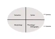 As a child acquires their vocabulary, two separate aspects of the mental lexicon develop named the lexeme and the lemma.[3] The lexeme is defined as the part of the mental lexicon that stores morphological and formal information about a word, such as the different versions of spelling and pronunciation of the word.[17] The lemma is defined as the structure within the mental lexicon that stores semantic and syntactic information about a word, such as part of speech and the meaning of the word. Research has shown that the lemma develops first when a word is acquired into a child's vocabulary, and then with repeated exposure the lexeme develops.[3]