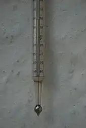 The mercury-in-glass or mercury thermometer was invented by physicist Daniel Gabriel Fahrenheit in Amsterdam (1714).[1] It consists of a bulb containing mercury attached to a glass tube of narrow diameter; the volume of mercury in the tube is much less than the volume in the bulb. The volume of mercury changes slightly with temperature; the small change in volume drives the narrow mercury column a relatively long way up the tube. The space above the mercury may be filled with nitrogen gas or it may be at less than atmospheric pressure, a partial vacuum.