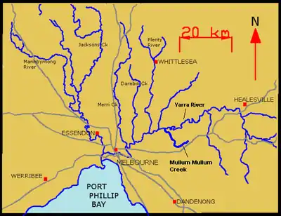 The Merri Creek is a waterway in southern parts of Victoria, Australia, which flows through the northern suburbs of Melbourne. It begins near Wallan north of Melbourne and flows south for 70 km until it joins the Yarra River at Dights Falls. The area where the creek meets the river was traditionally the location for large gatherings of the Wurundjeri people and is suspected to have been the location for one of the earliest land treaties in Australia between Indigenous Australians and European settlers.
