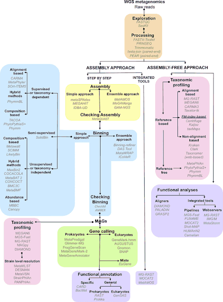 - Pérez-Cobas AE, Gomez-Valero L, Buchrieser C (2020). "Metagenomic approaches in microbial ecology: an update on whole-genome and marker gene sequencing analyses". Microbial Genomics. 6 (8). doi:10.1099/mgen.0.000409. PMC 7641418. PMID 32706331.