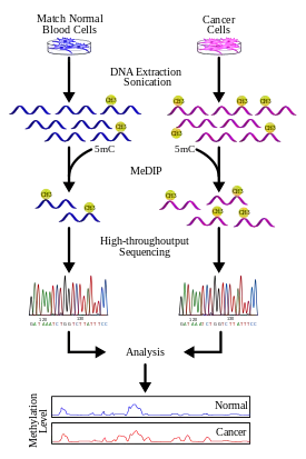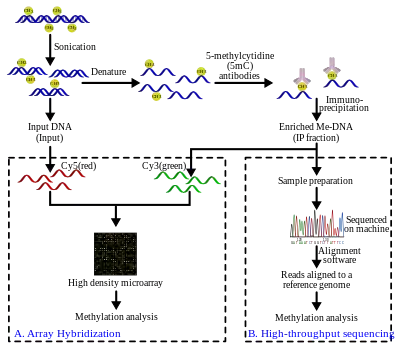 Methylated DNA immunoprecipitation (MeDIP or mDIP) is a large-scale (chromosome- or genome-wide) purification technique in molecular biology that is used to enrich for methylated DNA sequences. It consists of isolating methylated DNA fragments via an antibody raised against 5-methylcytosine (5mC). This technique was first described by Weber M. et al.[1] in 2005 and has helped pave the way for viable methylome-level assessment efforts, as the purified fraction of methylated DNA can be input to high-throughput DNA detection methods such as high-resolution DNA microarrays (MeDIP-chip) or next-generation sequencing (MeDIP-seq). Nonetheless, understanding of the methylome remains rudimentary; its study is complicated by the fact that, like other epigenetic properties, patterns vary from cell-type to cell-type.