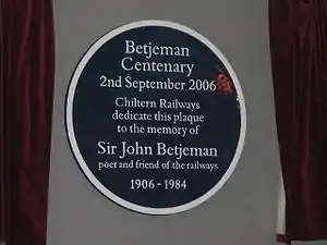 To mark the centenary of Betjeman's birth his daughter Candida Lycett Green (born 1942) spearheaded a series of celebratory railway events, including an excursion on 2 September 2006 from Marylebone to Quainton Road, now home of the Buckinghamshire Railway Centre.[54] Lycett Green noted of the planning of this trip that among the fine details considered were which filling to have in the baguettes on the train through Metro-land and how long it would stop on the track so that the poem "Middlesex" could be read over the tannoy.[55] The event was in the tradition of earlier commemorations of "Metro-land", such as a centenary parade of rolling stock at Neasden in 1963 and celebrations in 2004 to mark the centenary of the Uxbridge branch.