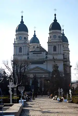 The Metropolitan Cathedral, Iași (Romanian: Catedrala Mitropolitană din Iași), located at 16 Ștefan cel Mare și Sfânt Boulevard, Iași, Romania, is the seat of the Romanian Orthodox Archbishop of Iași and Metropolitan of Moldavia and Bukovina, and the largest historic Orthodox church in Romania.[1] It is dedicated to Saint Parascheva, to the Presentation of Jesus and to Saint George. Its form was inspired by the late Italian Renaissance style (Trinità dei Monti in particular), with Baroque elements dominating the interior and exterior decorative features.[2] The Metropolitan Cathedral is listed in the National Register of Historic Monuments.[3]