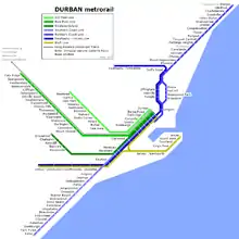 Metrorail KwaZulu-Natal is a network of commuter rail services in and around the city of Durban in KwaZulu-Natal province, South Africa. It is operated by Metrorail, a division of the Passenger Rail Agency of South Africa (PRASA).