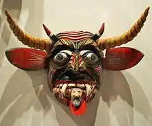 After the Conquest of the Aztec Empire, a number of Spanish historians noted indigenous religious rituals and ceremonies including those that used masks.[6] The Spanish banned pre Hispanic religion but the evangelizers used the cultures’ propensity for masks and spectacle to propagate the new faith, through plays and dance.[8][9][10] New dances evolved from the mystery plays and allegorical dramas used by evangelists.[11] One of the most important was a pageant that reenacted the battles between Christians and Moors, which used masks to imitate the Moors.[8] This dance was rapidly adopted by the indigenous and performed in indigenous languages.[11] Other masked dances developed in relation to Holy Week, Day of the Dead and the Conquest of Mexico, as well as Carnival, a European festival introduced by the Spanish.[9][12] The masks for characters such as Hernán Cortés, La Malinche, shepherds, devils, kings developed and became very diverse.[11] Little is known about masks from the colonial era, but at least some came from the same workshops that produced saint images, which had sophisticated and realistic depictions of faces. Others were mostly likely made by those who sold or rented costumes to performers. Some may have been made by the dancers themselves.[12] The developing dances and other masked events became part of a syncretism of Catholic and native traditions and belief, especially Carnival and Holy Week, with the first coinciding with the Aztec New Year and new agricultural cycle.[11] In addition, many of the masks developed during this time mocked colonial overlords.[13] For these reasons, a various times, masks and dances were forbidden by authorities from the 16th to 18th centuries.[12][14]