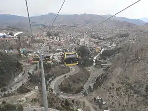 Mi Teleférico (Spanish pronunciation: [mi teleˈfeɾiko], English: My Cable Car), also known as Teleférico La Paz–El Alto (La Paz–El Alto Cable Car), is an aerial cable car urban transit system serving the La Paz–El Alto metropolitan area in Bolivia.[6] As of October 2019, the system consists of 26 stations (36 if transfer stations are counted separately per line) along ten lines: Red, Yellow, Green, Blue, Orange, White, Sky Blue, Purple, Brown, and Silver. Further lines and extensions are in planning or construction.[2]