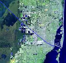 In its original natural state, the river started at rapids formed by water from the Everglades flowing over a rocky ledge four miles (6.4 km) from its mouth. Frederick H. Gerdes of the U.S. Coast Survey reported in 1849 that "[f]rom the upper falls to near its entrance into Key Biscayne Bay… water in the Glades was 6 feet 2.5 inches (1.892 m) above low tide".[5] The rapids were removed when the Miami Canal was dredged in an attempt to drain the wetland.[6]