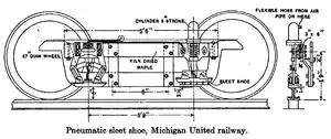 Much of the Michigan United's network used an electrified third rail to power the locomotives. Cars carried a "shoe" which rode on top of the third rail. This proved a problem during Michigan's notoriously harsh winters, when ice build-up on the tracks inhibited conductivity. To meet this challenge W. Silvius, the Michigan United equipment superintendent in Albion, developed a "pneumatic sleet shoe." The design was similar to a standard shoe, but included four steel cutters on the front to cut the sleet, while a system of air hoses allowed the motorman to lower as needed.[12]