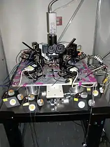 A micromanipulator is a device which is used to physically interact with a sample under a microscope, where a level of precision of movement is necessary that cannot be achieved by the unaided human hand.[1] It may typically consist of an input joystick, a mechanism for reducing the range of movement and an output section with the means of holding a microtool to hold, inject, cut or otherwise manipulate the object as required. The mechanism for reducing the movement usually requires the movement to be free of backlash. This is achieved by the use of kinematic constraints to allow each part of the mechanism to move only in one or more chosen degrees of freedom, which achieves a high precision and repeatability of movement, usually at the expense of some absolute accuracy.