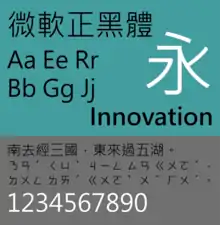 Microsoft JhengHei (微軟正黑體) is a sans-serif typeface included in Windows Vista and later and Microsoft Office 2007. It follows the Standard Form of National Characters prescribed by the Ministry of Education of the Republic of China (Taiwan) and is intended to be used in Traditional Chinese language environments using ClearType.