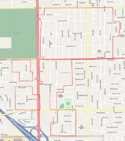 Two miles directly to the east of Midway City was the now-defunct Town of Bolsa,[7] which was established in 1870.[8] Midway City's northernmost boundary, Hazard Avenue, is named after the great grandparents of Clyde Hazard: early American pioneers Robert Samuel and Betsy Ann (née White) Hazard, who moved from Hitchcock County, Nebraska with their children to the Westminster district in August 1881 and subsequently purchased forty acres northwest of the Town of Bolsa on February 6, 1882.[5][9] Ann was a direct descendant of the White family, who relocated to Plymouth, Massachusetts in 1620 on the Mayflower.[9] In 1891, Midway City received its post office from Bolsa.[10] In 1915, one of the top United States poultry judges, W. M. Wise, moved from Michigan to perform breeding and service work for Pacific Southwest Poultry Farm in Midway City.[11] Seven years later, Midway City began to take shape in 1922 when John H. Harper purchased 200 acres (0.81 km2) of land based on the location of a local stagecoach stop and needs of the workers in the Huntington Beach Oil Field located west of the stagecoach stop.[4][5] Harper subsequently subdivided his land by laying out streets, building sidewalks, and, in 1923,[4] started selling lots.[5] As the Huntington Beach Oil Field expanded, the homes in that area that stood in the path of drawing oil from the ground were physically relocated to Harper's lots in Midway City, which "started Midway City."[12] The area, which now includes four[13] unincorporated anemic sections as a result of annexation for the Westminster business district,[14] is known as Midway City and the largest section looks like a crooked letter "P".[15] Midway City is six miles from Santa Ana, six miles from Huntington Beach, and seven miles from Long Beach, giving rise to the Midway City name.[16] Harper Street, which vertically bisects the largest of the four Midway City section, is named after John Harper.[4]