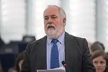 In 2014, Arias was picked by Rajoy to lead the Partido Popular's list in the 2014 European elections.[10] Following the elections, Spain nominated him for the Juncker Commission in August 2014.[10] By early September, European Commission President Jean-Claude Juncker assigned Arias to the office of European Commissioner for Climate Action and Energy, where he became the first single supervisor of those two policy areas.[11] He took office on 1 November 2014.[12] In this capacity, he works under the guidance of Maroš Šefčovič, the European Commission Vice President for Energy Union.