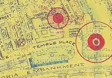 At the south end of the lane, Two Temple Place was built in 1895. Around the same time, Bodley and Garner's London School Board Building was erected in Temple Place. It was replaced by Electra House, the headquarters of Cable & Wireless, in 1929. Its eastern side was hit by a V-1 flying bomb on 24 July 1944 during the Second World War, demolishing part of it, blocking the lane and trapping people in rubble at 28 Essex Street. Three people died, 17 were injured.[9] The building was repaired but demolished in 1999 and replaced by Globe House, now the headquarters of British American Tobacco.[10]